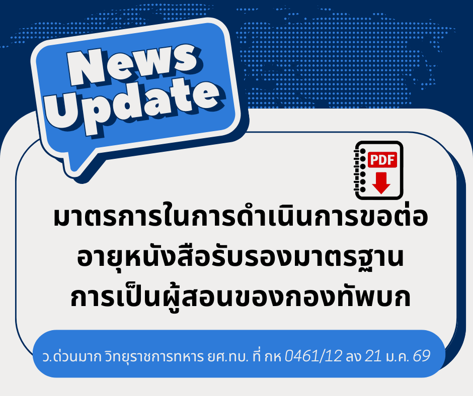 ว.วิทยุขอให้หน่วย และสถานศึกษาของ ทบ. ตรวจสอบรายชื่อครู อาจารย์ ที่มีหนังสือรับรองมาตรฐานการเป็นผู้สอนของ ทบ. โดยกรอกข้อมูลใน Google form ตั้งต่วันที่ 25 มี.ค. 67 เป็นต้นไป |